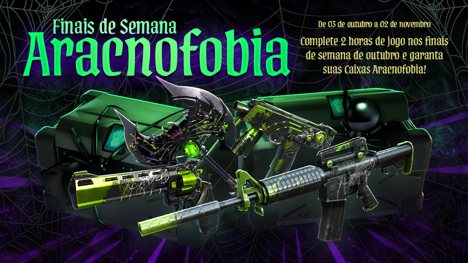 E tem mais! Ao cumprir o tempo de jogo, você será recompensado com Caixas Aracnofobia. Cada final de semana jogado aumenta a sua coleção!