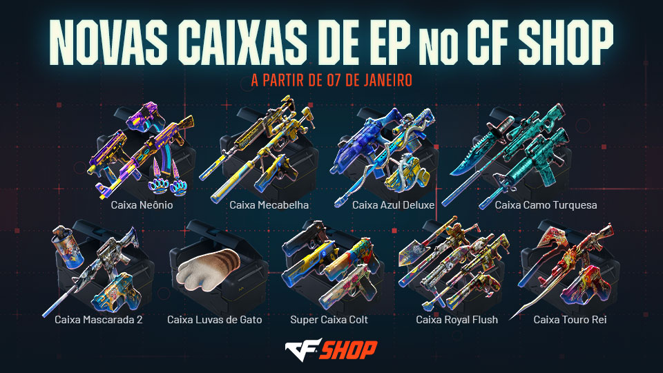 As novas caixas estarão disponíveis no CF Shop em pacotes de 1, 5 ou 10 unidades. Escolha as suas e aumente suas chances de turbinar o arsenal!