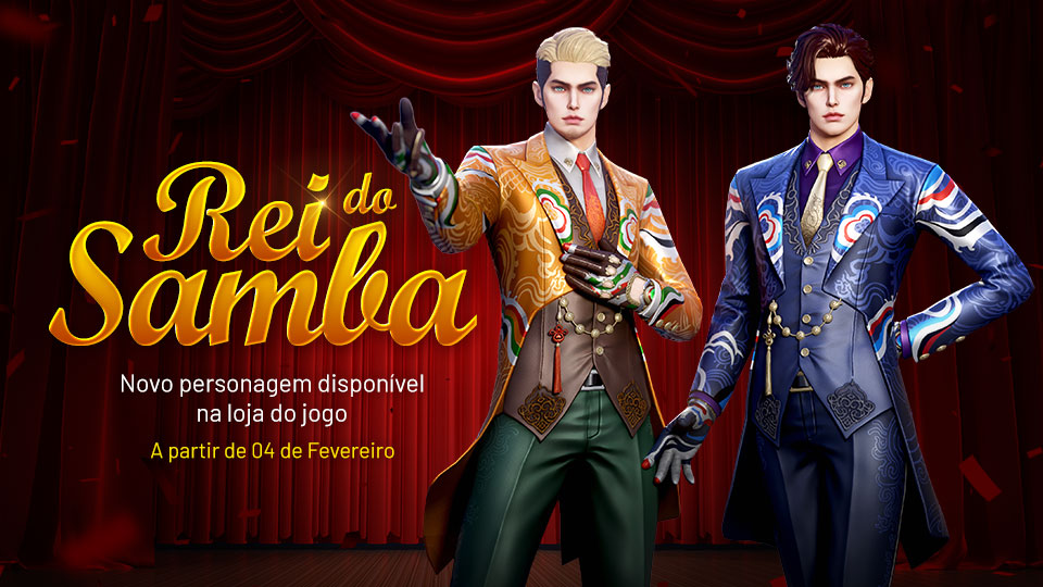 O Rei do Samba leva o espetáculo para o campo de batalha. Com traje luxuoso e cores vibrantes, ele une elegância, ritmo e presença marcante, refletindo diferentes estilos de combate inspirados na celebração e na arte.
