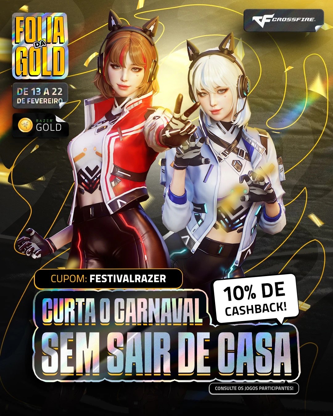 Entre os dias 13 a 22 de fevereiro, receba Cashback de 10% em sua primeira recarga através da Promoção Folia na Razer Gold.